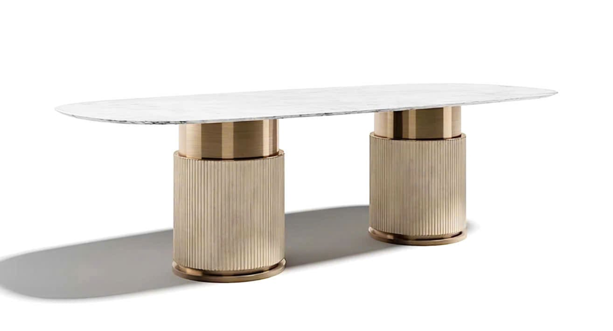 Bàn ăn David Aristocrate là sự kết hợp gỗ cắt lớp tạo gợn sóng art , đá marble trắng Volacas và inox mạ vàng bóng PVD cao cấp .