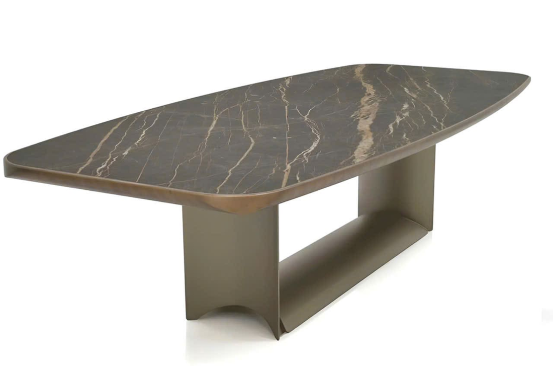 Bàn ăn David Elysium là sự kết hợp đá marble nâu Tây Ban Nha và inox mạ PVD mờ cao cấp .