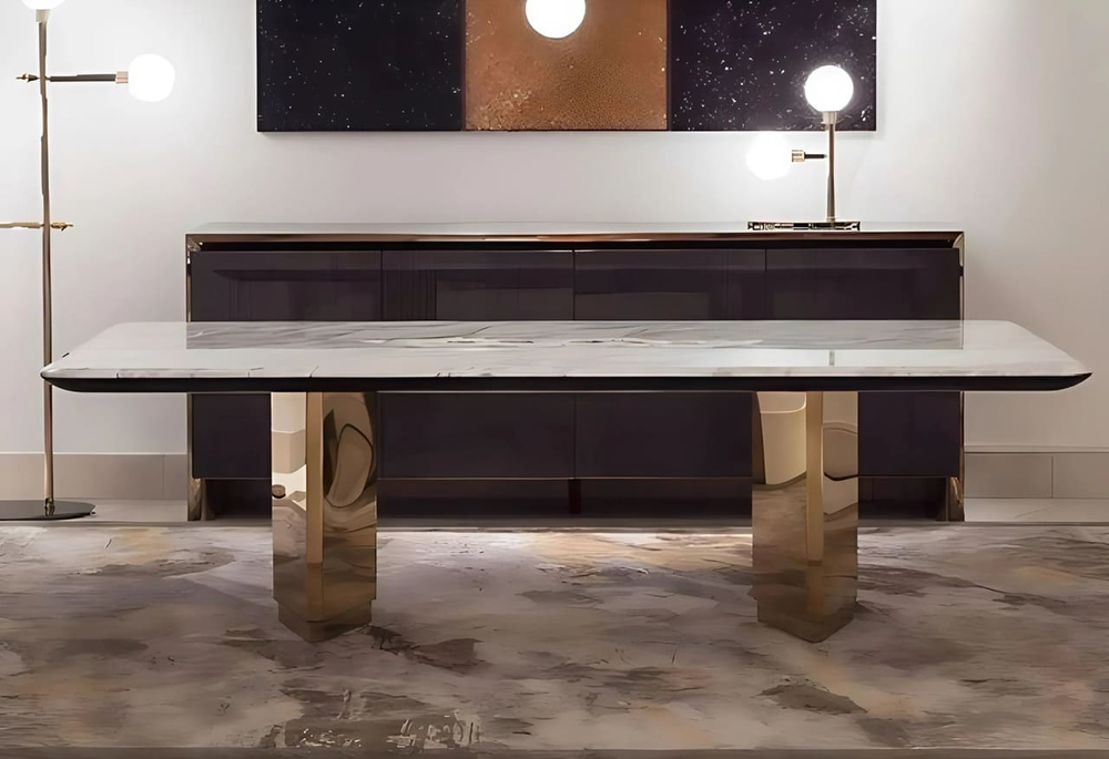 Bàn ăn David Imperium là sự kết hợp đá marble trắng vân mây và inox mạ vàng bóng PVD cao cấp .