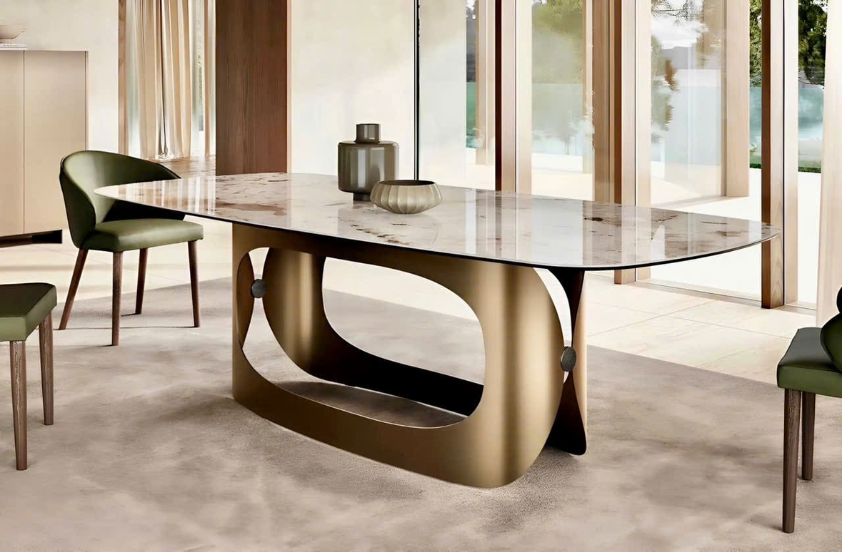 Bàn ăn David Opal là sự kết hợp đá marble trắng Volacas và inox mạ vàng mờ PVD cao cấp .
