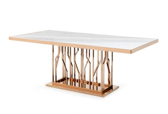 Bàn ăn David Elysian là sự kết hợp đá marble trắng Volacas và inox mạ vàng bóng PVD cao cấp .